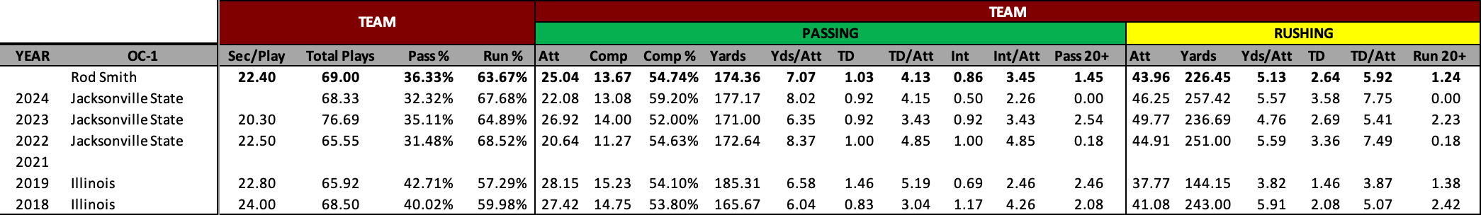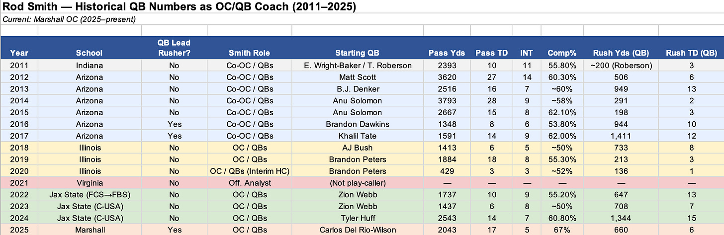 Not captured in the table is Smith’s only other stint as a play caller—a brief time spent as the OC at, ironically, USF in 2005 and 2006. In ‘06, his QB, Matt Grothe, led the team in rushing with 622 yards and nine scores on 178 attempts. The ‘05 team was led by the RB (who saw 270 carries), and the QB scored four rushing TDs and accumulated 336 yards.