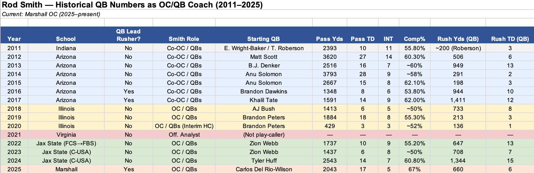 Beyond his impact as a play caller, some of the players Smith has helped develop as a QBs coach include: Denard Robinson (Michigan) and Pat White (WVU), two of the most dangerous rushing QBs in CFB history.