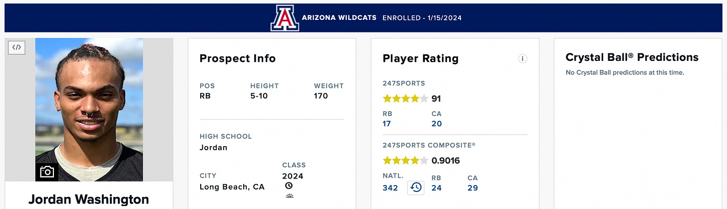 As far as what there is to like about Washington, I would say that first and foremost, his output on a limited workload confirmed that he is an explosive player—he finished 2025 averaging 8.6 YPC on 27 carries. In total, he accumulated 233 yards and a score. Here’s what 247’s Greg Biggins had to say about Washington coming out of high school: