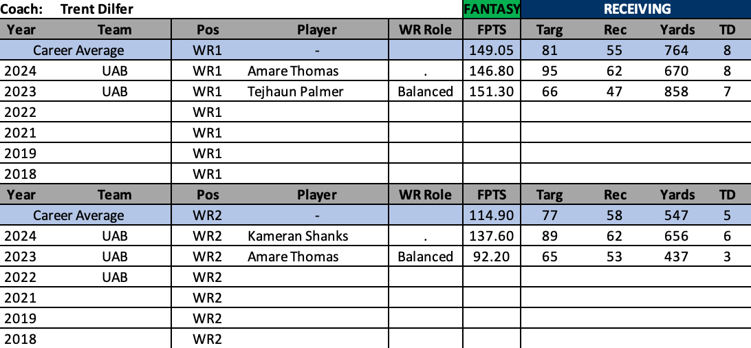 Both head coach Trent Dilfer and OC Alex Mortensen have a two year sample of data to draw from as play callers. Both seasons occurred at UAB dating back to 2023. In each case, the WR1 PPG average was virtually the same (~12 PPG).
