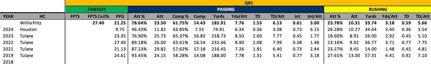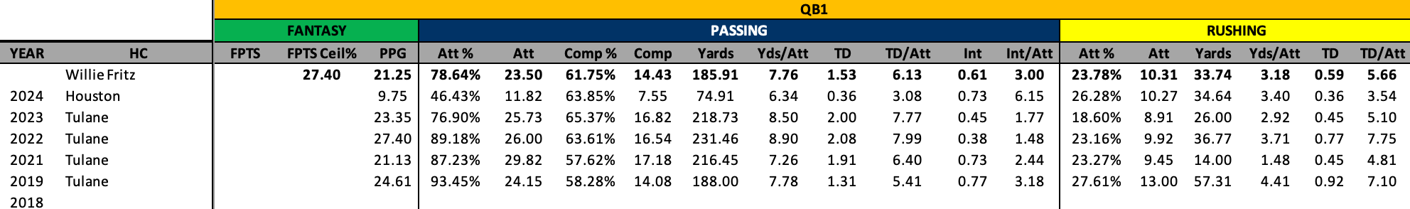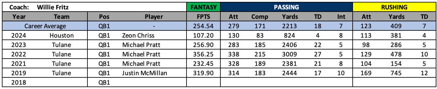 Head coach Willie Fritz’ average is included in the sub-header above, but I feel like the QB average needs to explained a bit. You’ll see below a breakdown of the individual numbers per season dating back to 2019.
