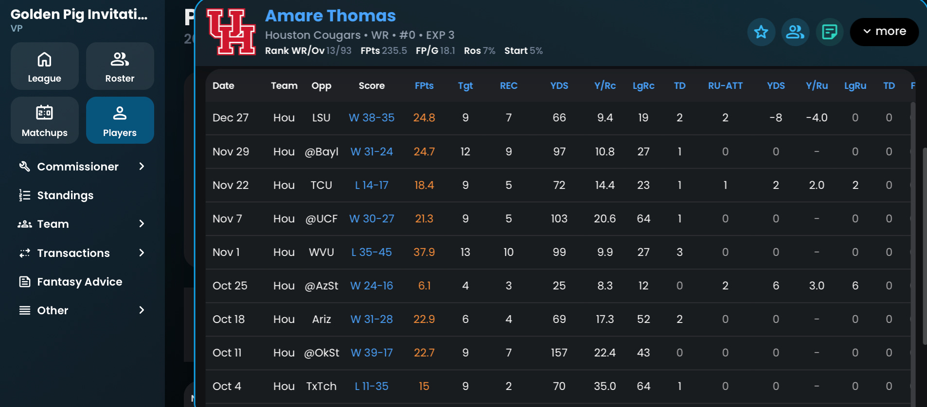 With Houston, he opened the year scoring 13, three, and eight points, and then proceeded to score no less than 15 in a game every appearance after, save for one six pointer vs. Arizona State; Nov. 1st onward was a particularly hot stretch, where Thomas scored over 20 points in four of five appearances, and scored a TD in every game during that span.
