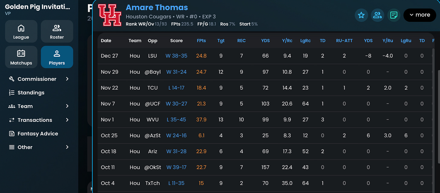 The move paid dividends for Weigmann and his CFF shareholders. He finishes 2025 averaging over 26.9 PPG including his performance in the bowl appearance, which is pretty good. I always feel like 25-27 PPG is sort of the threshold of a ‘good’ QB season in CFF.