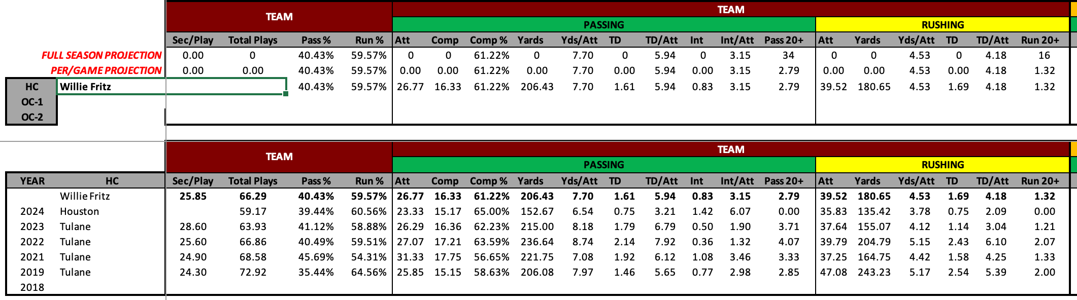 On average, Fritz’ teams will skew heavy run. The closest to a balanced ratio a team under him has finished was 2021 Tulane (45/55 to the run).