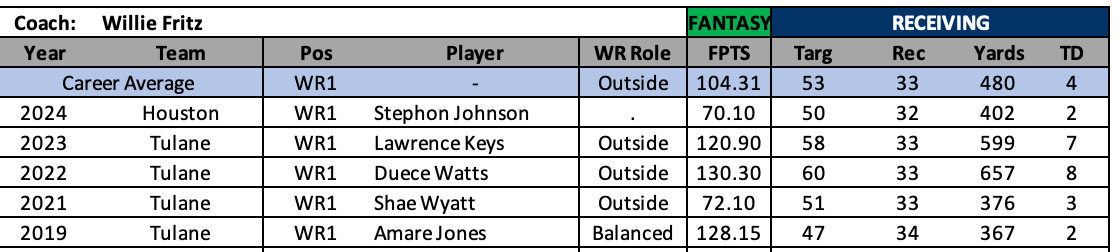 If not for a truly disastrous season in 2024, Fritz’s QB1 average would be a respectable 24-25 PPG. I suppose once Weigmann’s 2025 numbers are factored in it may balance out. All the same, this coach may not be known as an offensive wizard, but he does have a pretty solid track record at QB.