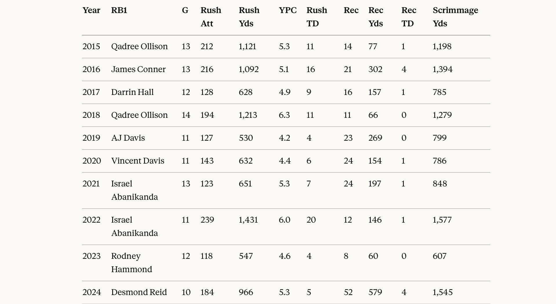 He’s only had one runner eclipse 1000+ rushing yards, but four of his seven have hit 1000+ total yards, which in some respects is even better depending on the CFF scoring format you’re playing in.