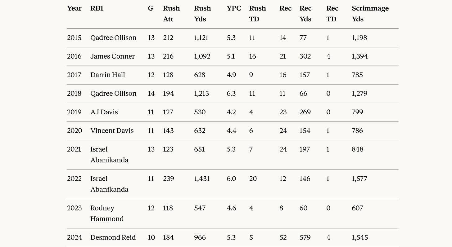 Now, while saying that Bell is the star of the show I don’t want to obfuscate Mr. Narduzzi’s positive influence here. He himself has had four 1000+ yard rushers since joining Pitt— the first being Qadree Ollison (2015, 2018), James Connor (2016) and finally, Israel Abanikanda (2022).