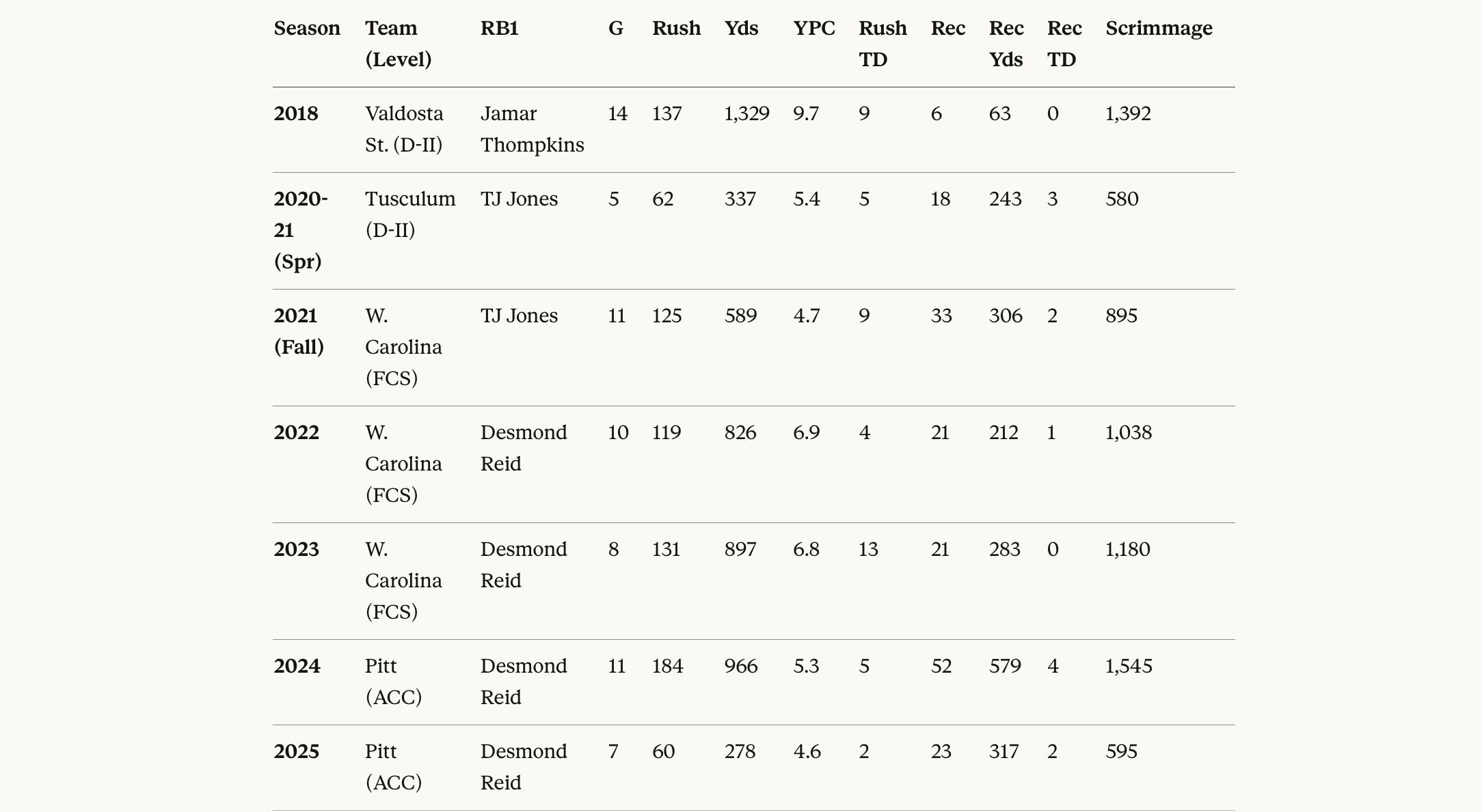 Below is a summary of Kade Bell’s RB1 season stats dating back to his D-II days at Valdosta State.