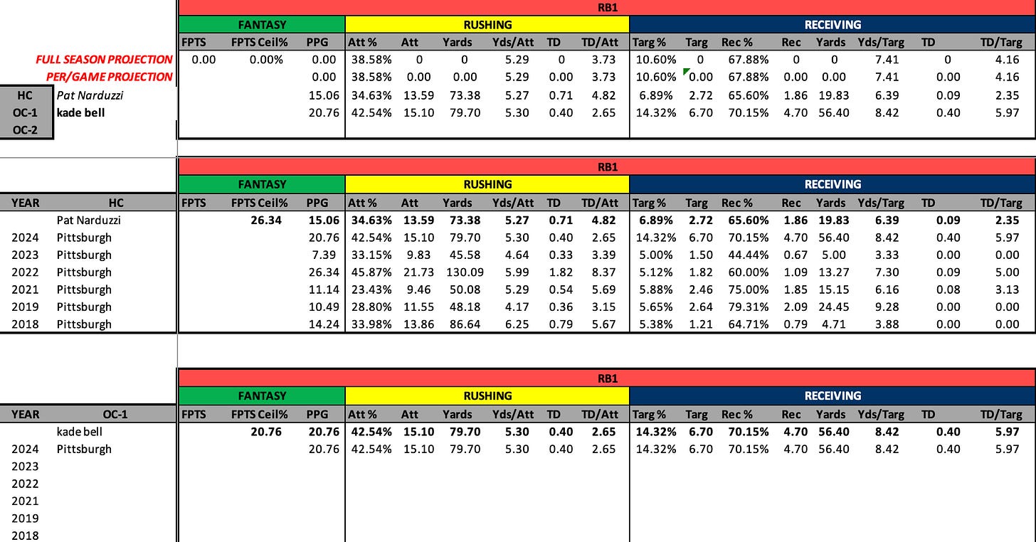 Coming back to Bell now, his positive influence extends beyond RB receiving usage. In the two years that he’s been with the Panthers, they were top three and top 22 in the FBS on a seconds per play basis. In other words, his offence is very up-tempo, which generally bodes well for production.