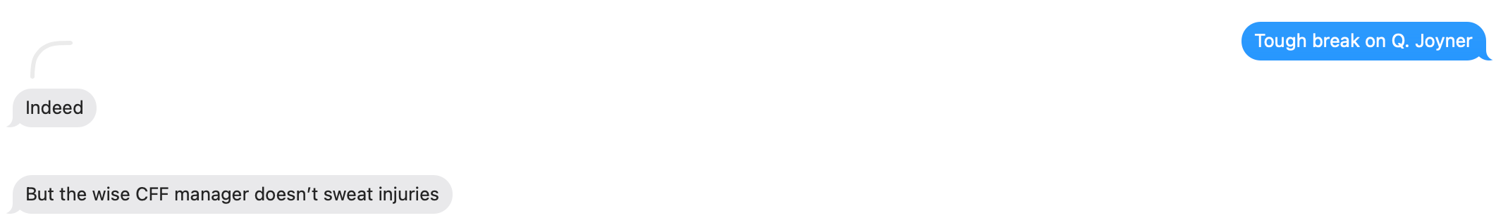 Joyner’s season-ending knee injury is a tough blow for all involved, obviously, but I want to share a quick text message exchange I had with a close friend of mine, Henri, who has been one of the most successful CFF managers in my home league, “The Golden Pig Invitational,” and who had spent a second-round pick on Joyner this year: