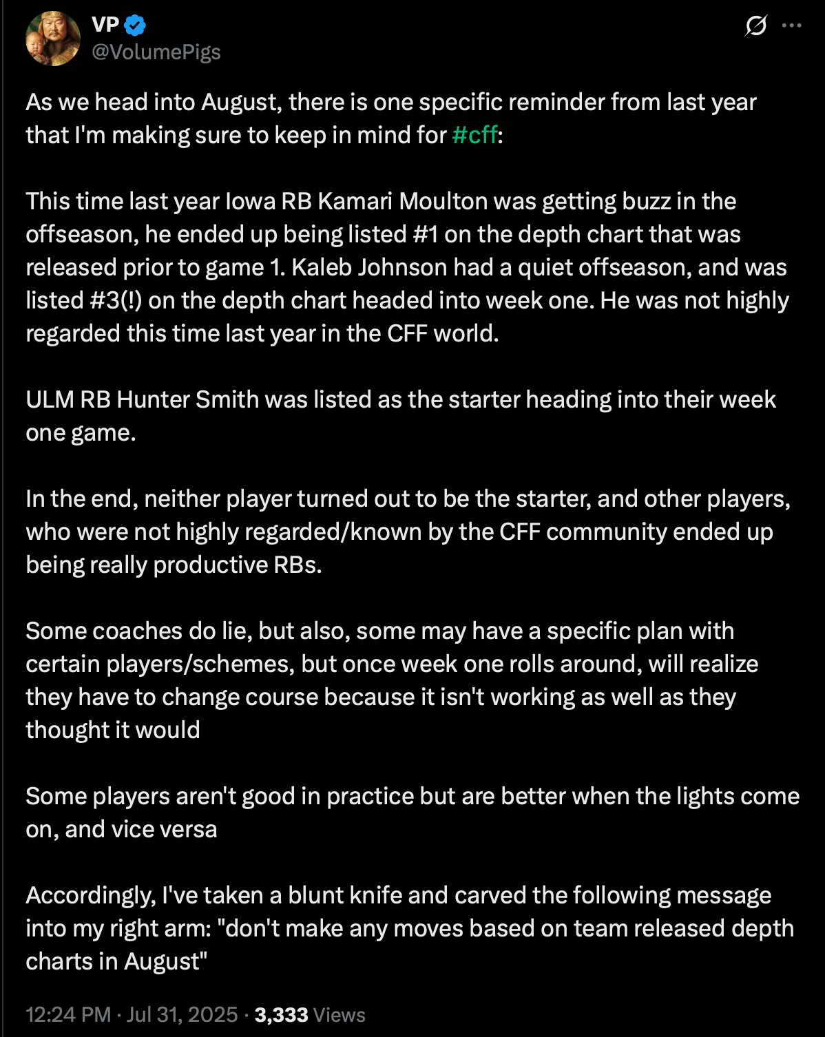 Which brings me to my point; in case you’ve been sleeping under a rock these past few weeks, there have been some unfortunate season-ending injuries. As has become customary in August, a CFF darling at RB—Quinten Joyner—suffered a season-ending knee injury on August 18th. This is around the same time that Texas’ CJ Baxter lost his 2024 season last year.