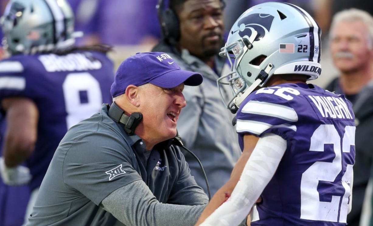 The aforementioned Chris Klieman is the head coach of KSU, and has been since 2019. His background is on the defensive side, rising up the ranks at the FCS level as DC at North Dakota State and Northern Iowa in the 2010s. He’s a midwest guy, that much is obvious. However, since his background is defence, I’m going to focus more on the new OC, Connor Riley, who was elevated up from offensive line coach, and the new co-OC, Matt Wells, who figures to also be involved in calling plays.