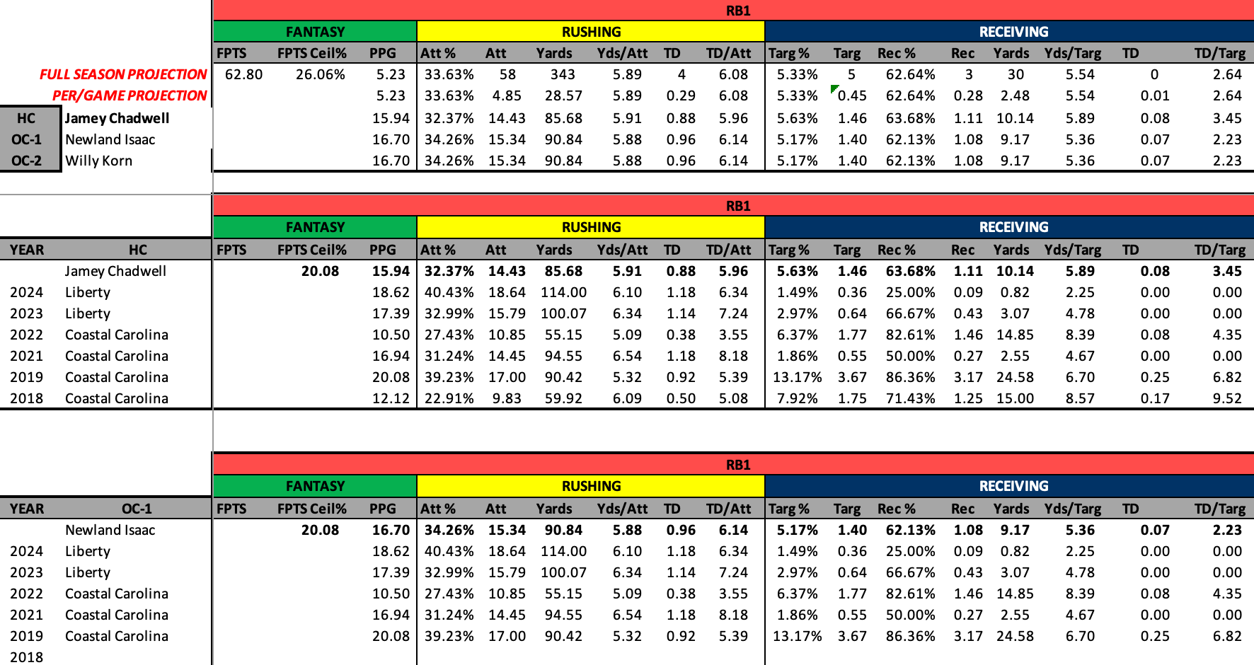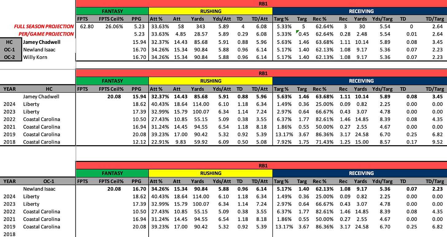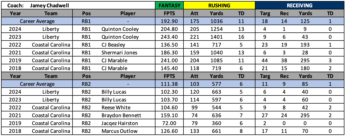 Head coach Jamey Chadwell has been with the program since 2023. Prior to that he was the head coach of Coastal Carolina between 2019 and 2022. In general, his system has been pretty solid for RB1 production (as can be seen in Table 1. below).