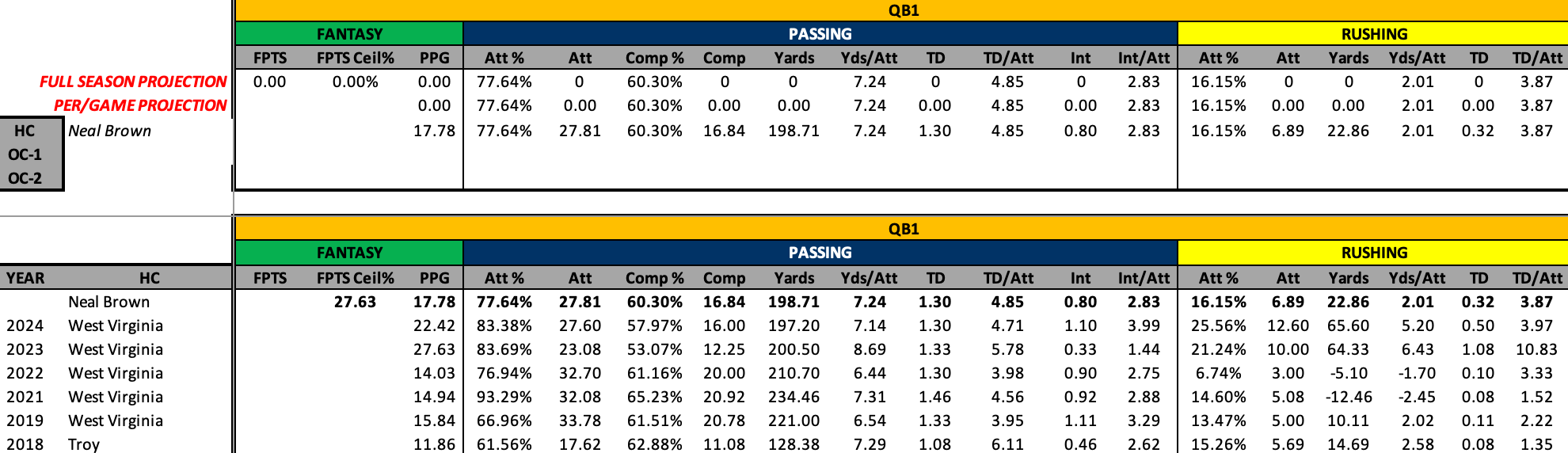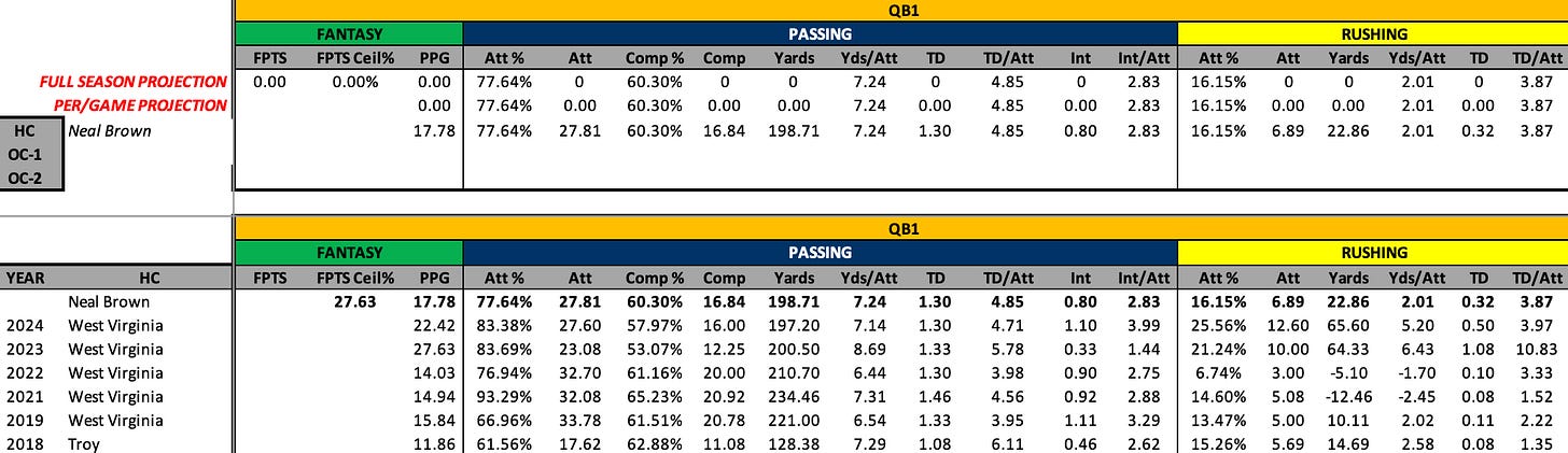 But Mr. Brown knows a thing or two about maximizing undersized, dual-threat quarterbacks as well. It was his QB in 2023, Garrett Greene, who torched CFB to the tune of 29 TDs (13 rushing) and over 3100 yards (772 rushing). Greene averaged 27 PPG that season using five point passing TDs as the measurement. That’s pretty good.