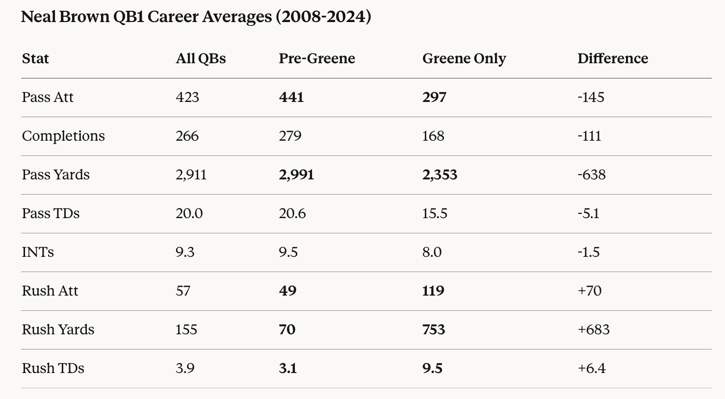 The trade-off there was that Brown’s QBs seldom ran the ball. They averaged just under 50 carries per season prior to Greene’s influence, and only around 70 yards.